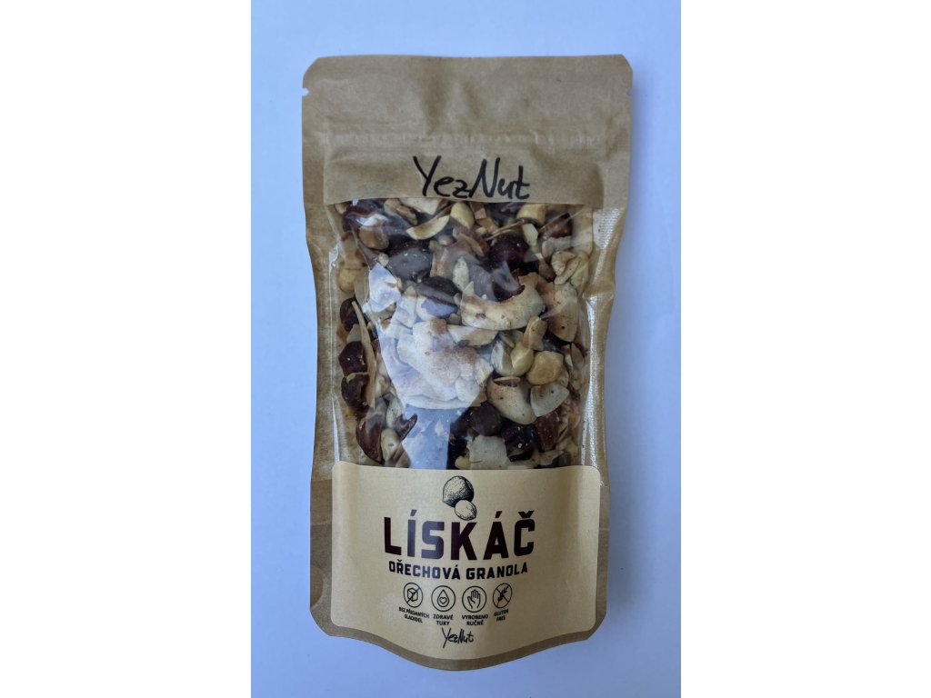 Ořechová granola, s lískovým oříškem v hlavní roli. Do party jsme přizvali prověřený mix kešu, mandlí, kokosových chipsů a slunečnicových semínek.