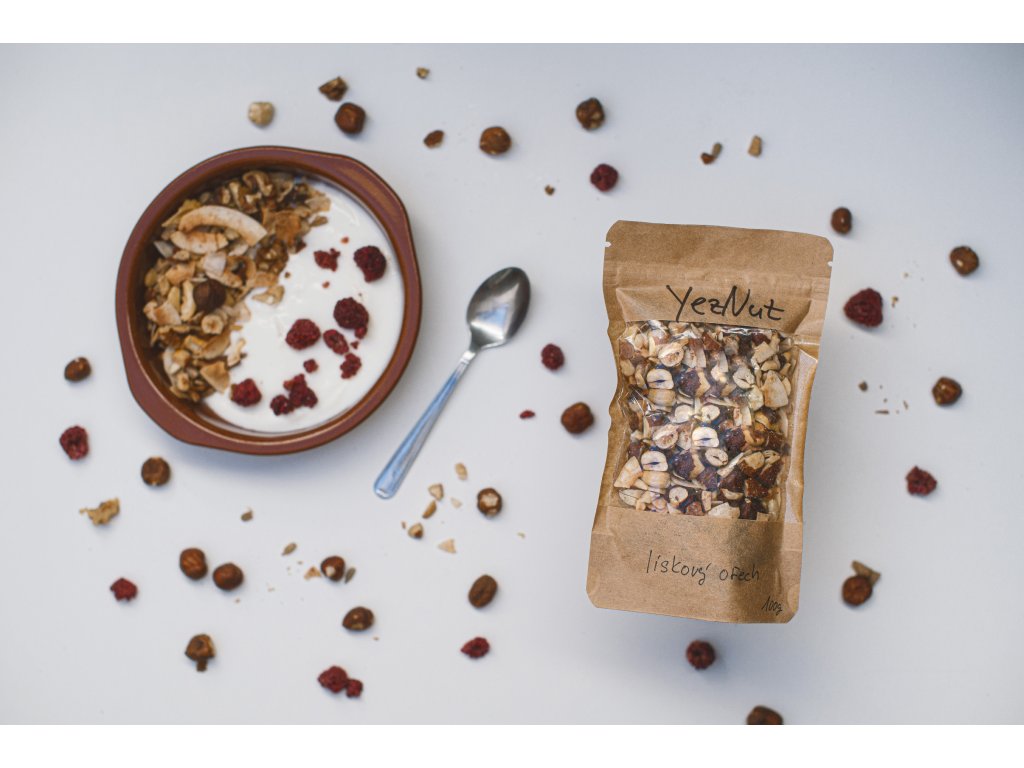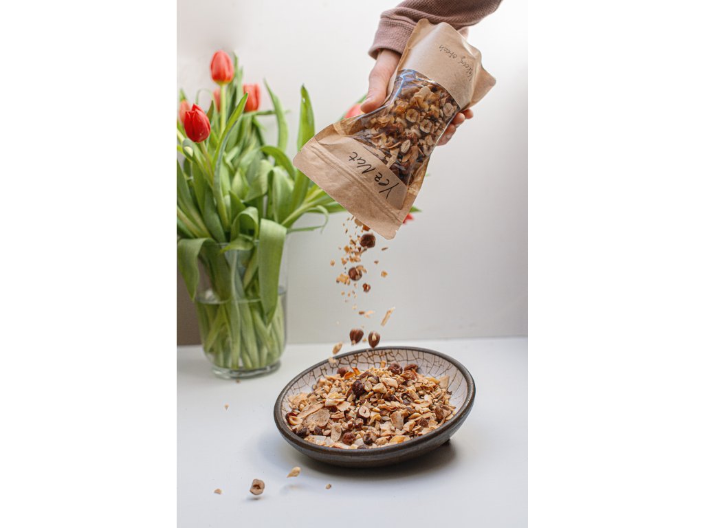 Složení: lískový ořech, kešu, mandle, kokosový chips, slunečnicové semínko, bio kokosový olej, bio skořice.