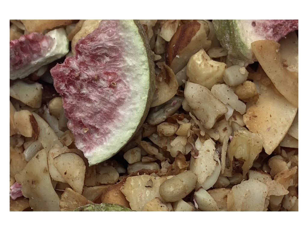 Ořechovou granolu s vlašským ořechem jsme spojili s krásnými a sladkými mrazem sušenými fíky. Oproti klasickým sušeným fíkům jsou ty lyofilizované křupavé a jsou bez přidaných cukrů a aditiv. Kombinace ořechové granoly a fíku vás potěší ráno či během dne. Skvělý zdroj kvalitních živin a to s minimem sacharidů.