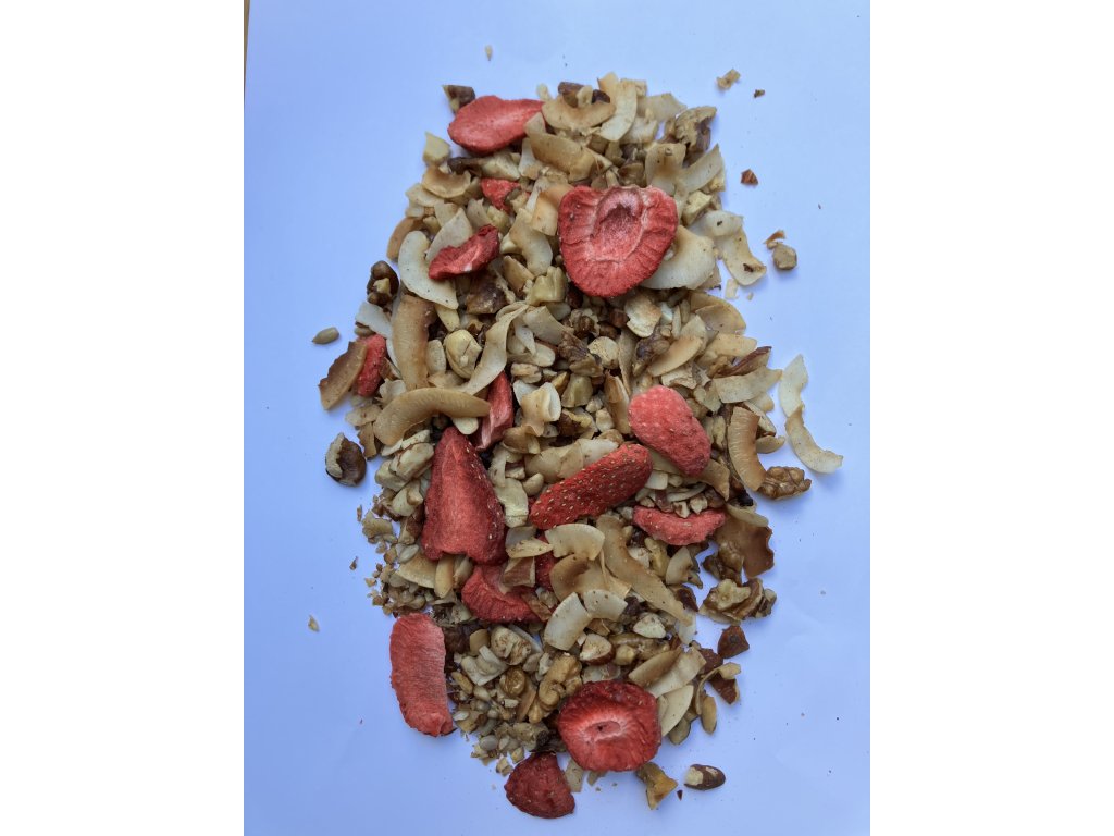 Složení: vlašský ořech 30,9%, kešu 20,6%, mandle 15,5%, kokosový chips 15,5%, slunečnicové semínko 8,2%, lyofilizované jahody 6,2%, bio kokosový olej, skořice